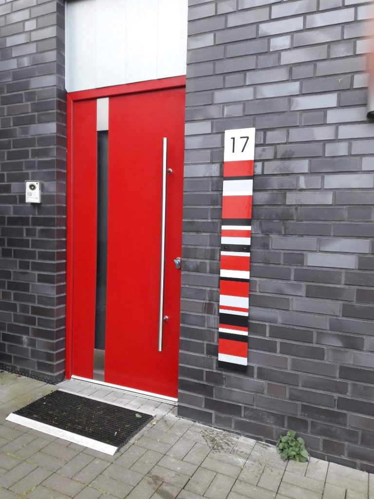 Bei meinen Farbfeld-Hausnummern ist der Nutzen einer Hausnummer mit der Schönheit eines Kunstwerks aufs Engste verbunden.Das Material ist wetterfest verleimtes Sperrholz, zusätzlich grundiert und lackiert. Die Größe, die Ausrichtung und die künstlerische Gestaltung des Farbfeld-Teils geschieht jeweils individuell. Sie richtet sich nach vorhandenen Fluchten, bereits am Ort vorkommenden Farben und auch nach meiner Inspiration. Alle Farbfelder befinden sich in einem farblichen Rhythmus. Die Palette der Möglichkeiten reicht von expressiv bis harmonisch eingefügt in die räumliche Situation an Ihrem Haus.